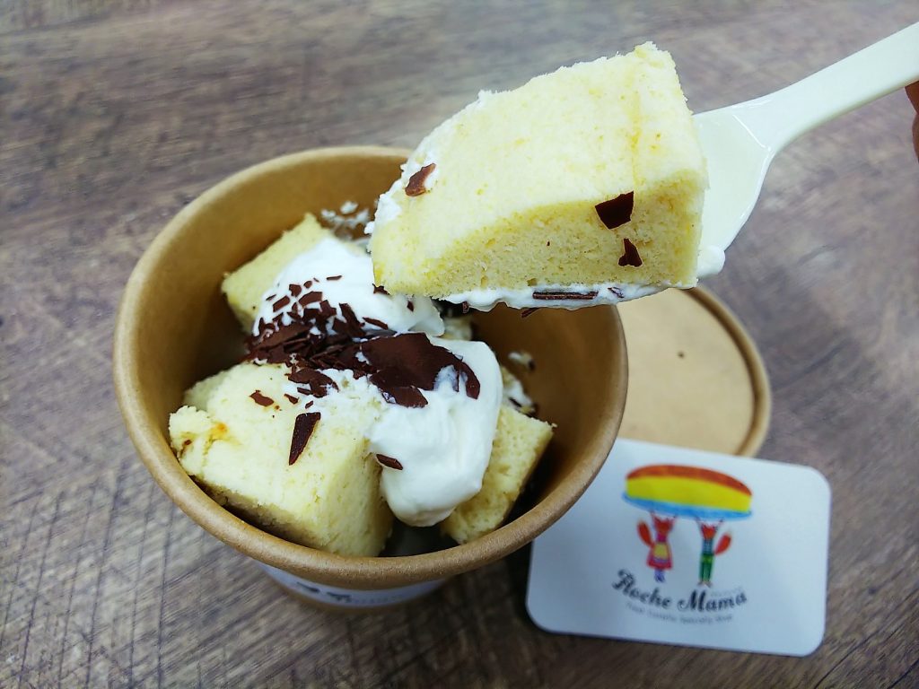 ひと口サイズにカットされたカステラと甘さ控えめの生クリーム、削りチョコがトッピングされています。