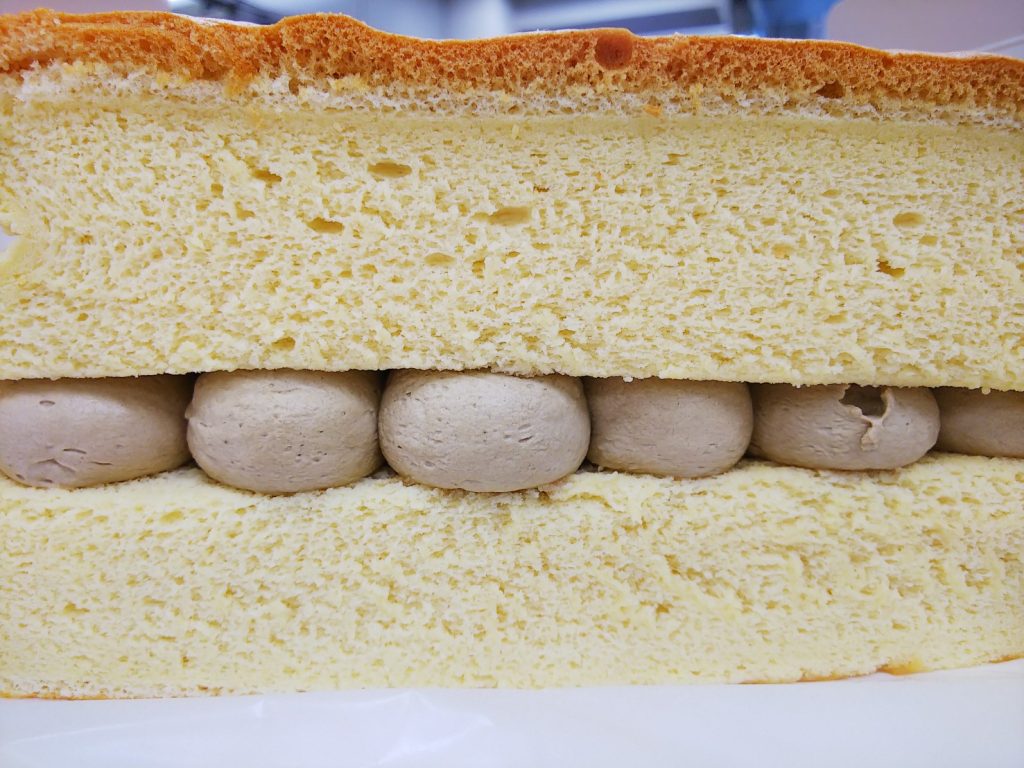 はい、こちらが生カステラの断面です。挟まっているのは、香ばしいほうじ茶クリーム(1200円)