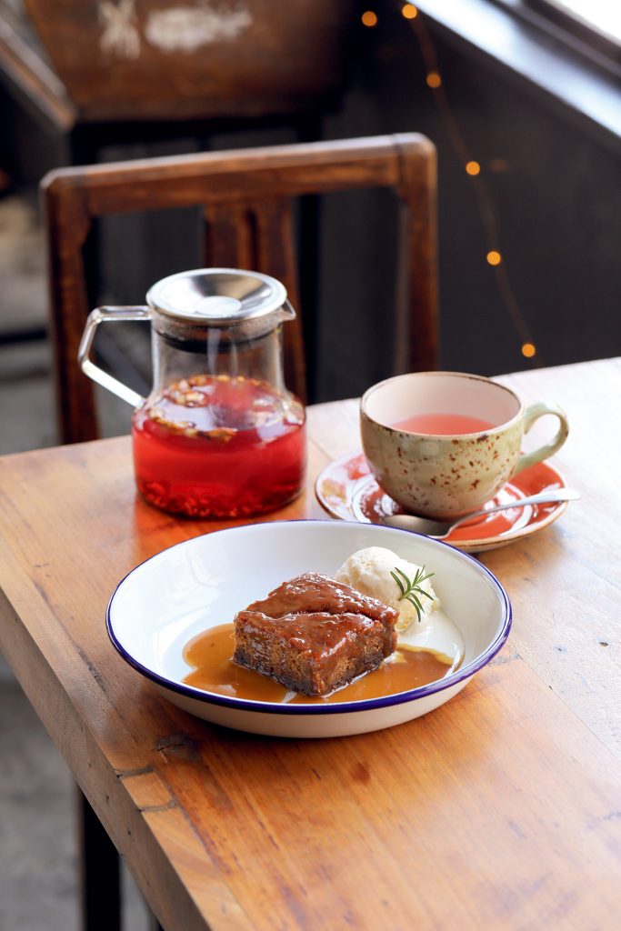 「スティッキートフィープディング」は、ナツメヤシのケーキに、温かいトフィーソースと冷たいバニラアイスが絡む至福のひと品!