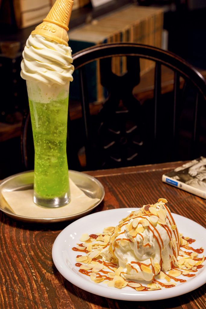 見た目のインパクトも抜群な「クリームソーダ」(880円)と、「キャラメルシフォンケーキ」(638円)