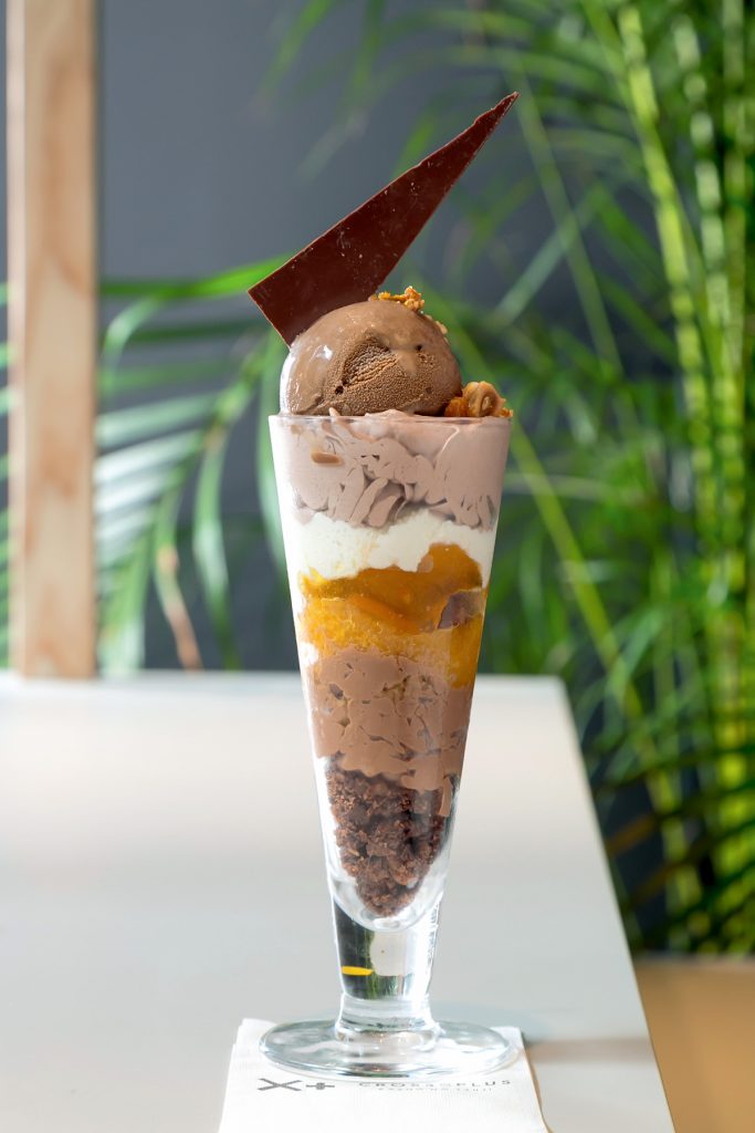 「パフェ」(780円)には、フィリピン・ダバオ地方産のカカオ豆を使った「AURO CHOCOLATE」のチョコがたっぷり。カカオ香る大人の味です