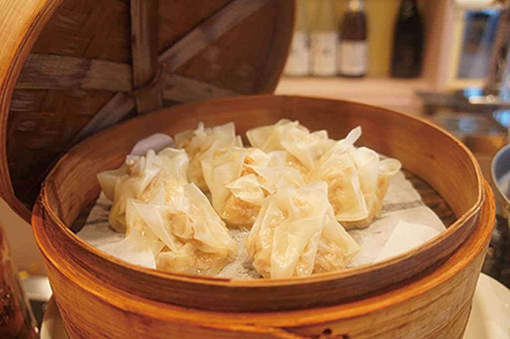 蒸したて熱々でいただくジューシーな焼売は人気メニューのひとつ。味変には国産の黒酢でさっぱりと!