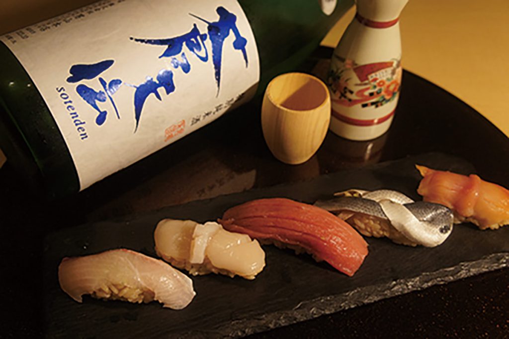 旬のネタ赤酢のシャリで握ったお任せにぎり5貫(1,580円)は、純米酒と一緒に楽しむのがおすすめ