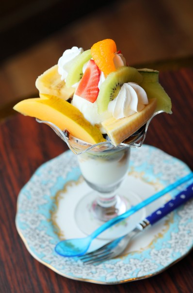 コーヒーのほろ苦さとクリームの甘さ、果物の甘酸っぱさがマッチする「コーヒーゼリーパフェ」(650円)