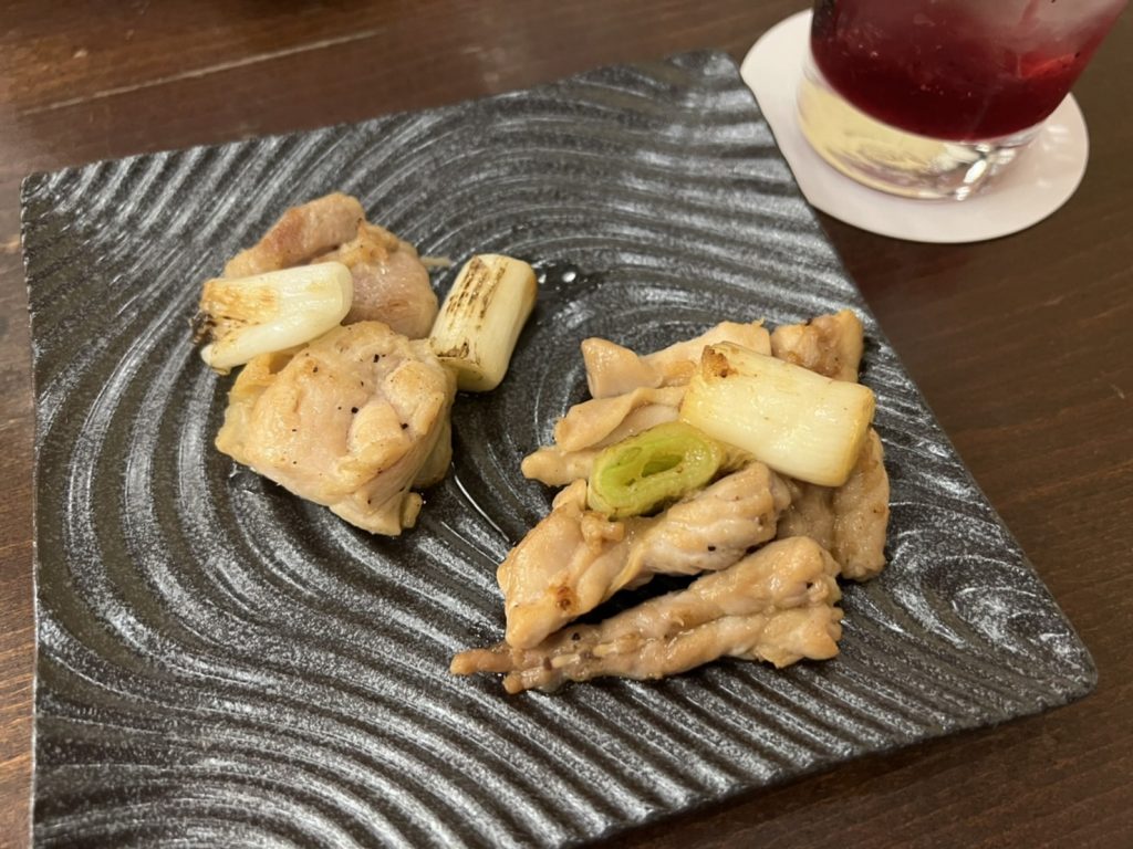 こちらは「いわい鶏焼き鳥2種盛り(もも、せせり)」。ももは塩味、せせりは甘ダレで味付けされています
