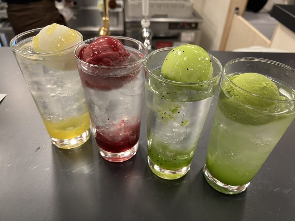 底に沈むリキュールをかき混ぜながら飲み進めるうちに、シャーベットがゆっくり溶け、徐々にひんやりあま~い味わいに変化。見た目も可愛く、全種類並べて写真を撮ってしまいました。