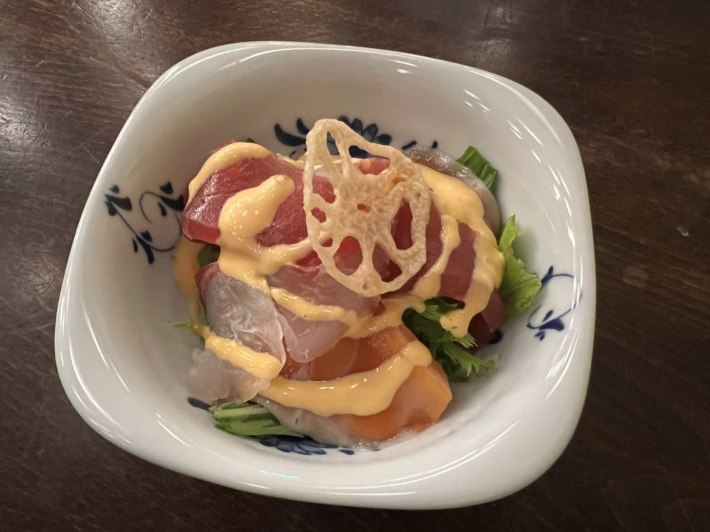 続いて登場したのは「海のサラダ」。刺身に自家製のサウザンドレッシングがかかっています