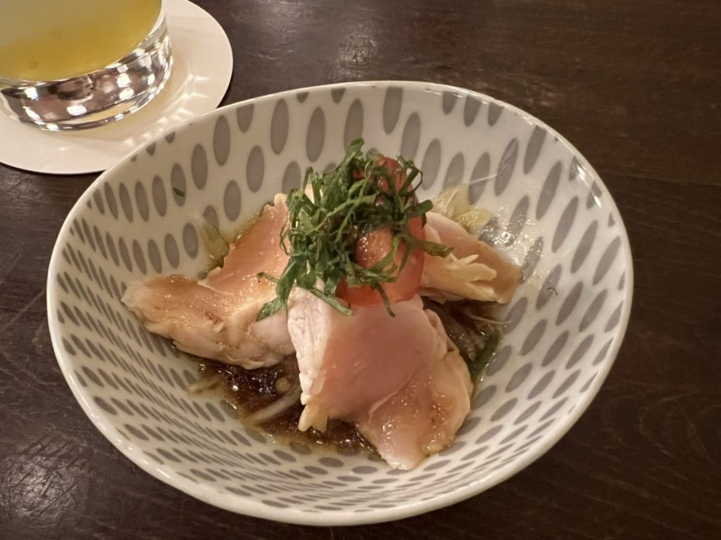 お通しの「鶏わさ」。しっとり柔らかで、下に隠れる玉ネギを巻いて食べるとさっぱりとした味わいに