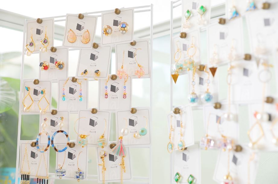 ショートヘアに映えるイヤリングなど、店内ではオリジナルのアクセサリーも販売しています