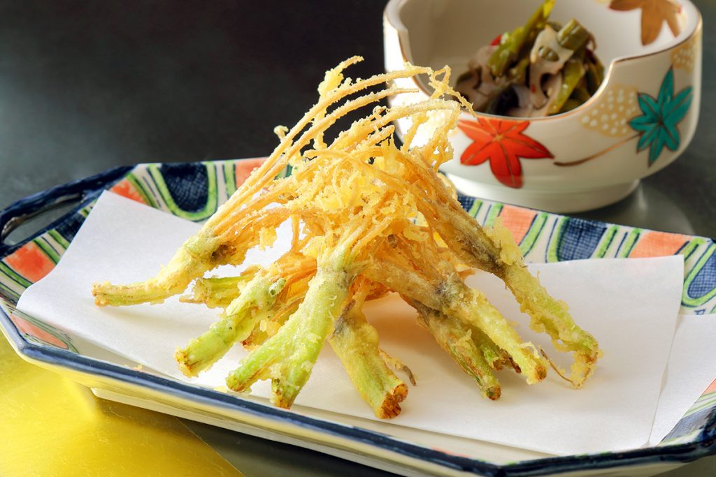 「芹根の天ぷら」(※写真奥は「セリとレンコンのきんぴら」)。太さのあるセリの根は、揚げるとホクホクとした食感に変化