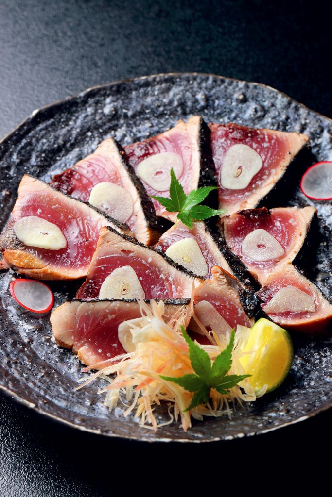 宮城県産のカツオを藁焼きにした「鰹の塩タタキ」。藁の香りがふわりと鼻に抜ける逸品