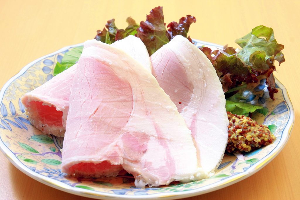 志波姫豚の「手作りロースハム」。煮込んだセロリやニンジンなどの野菜エキスと肉の旨みが絶妙に絡み合うひと品