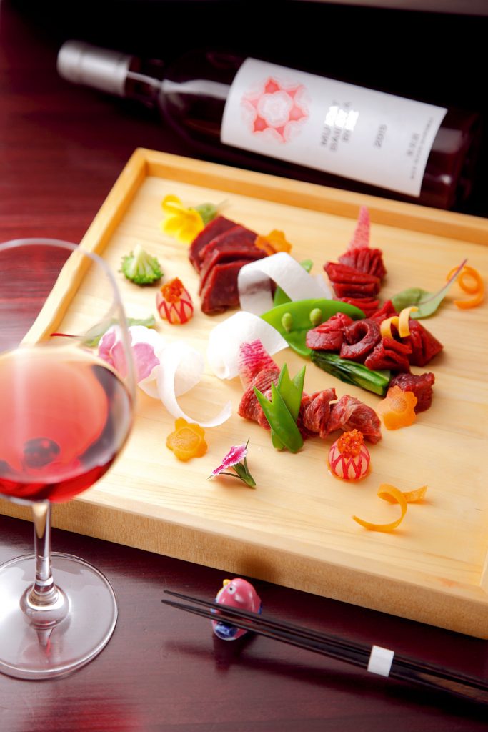 会津坂下から直送された「桜さし盛合せ」。「日本三大馬刺」と言われる珠玉の味わいを心ゆくまで味わって
