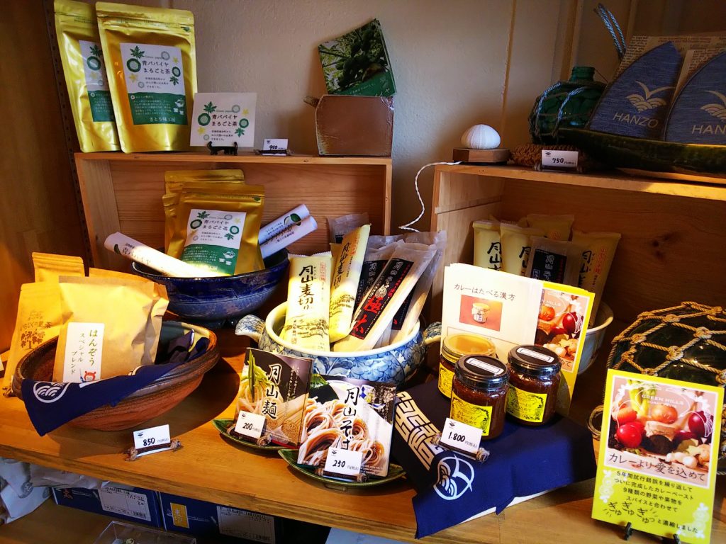 お店の入口には青パパイヤ茶や山形県・月山のそばなど、親方と女将さんが出会った東北の「おいしいもの」が並んでいます。気に入ったら買うこともできますよ。