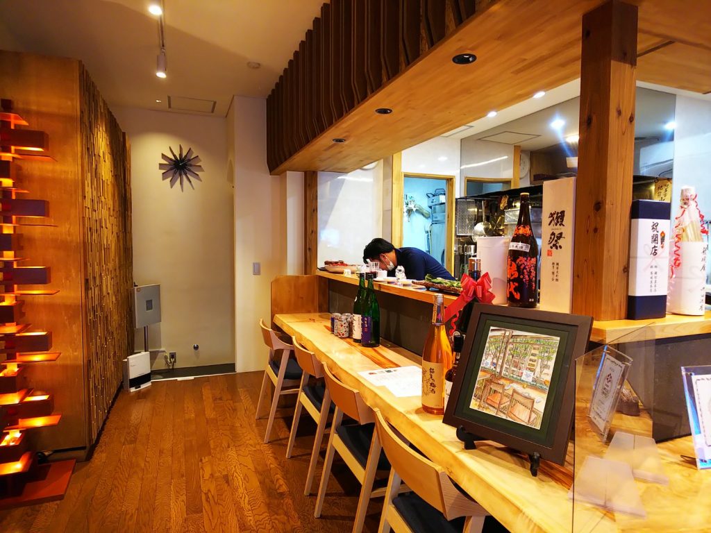 木の温もりが感じられる店内には、石巻の杉を使用。カウンターは、遠刈田にあった樹齢100年超えの栃の木で作られています。