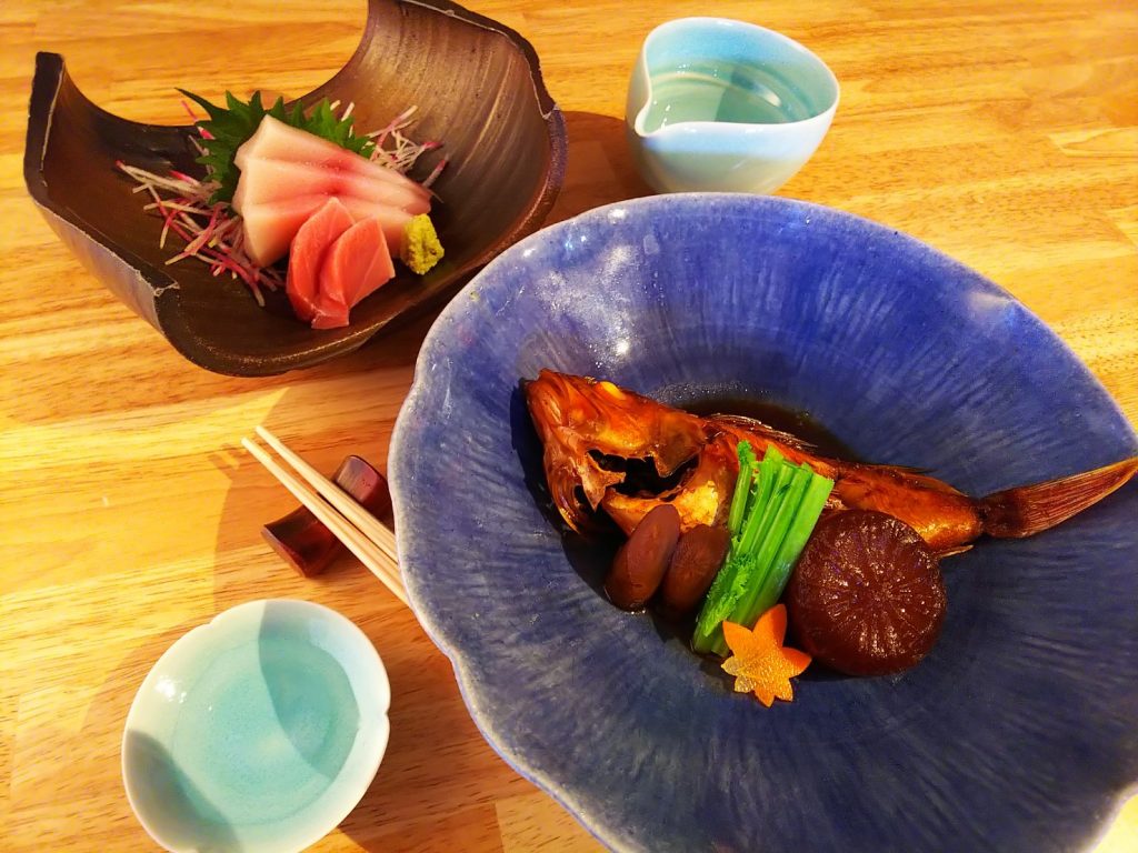 ユメカサゴの煮つけ(手前)、本マグロとメカジキのお刺身(奥)