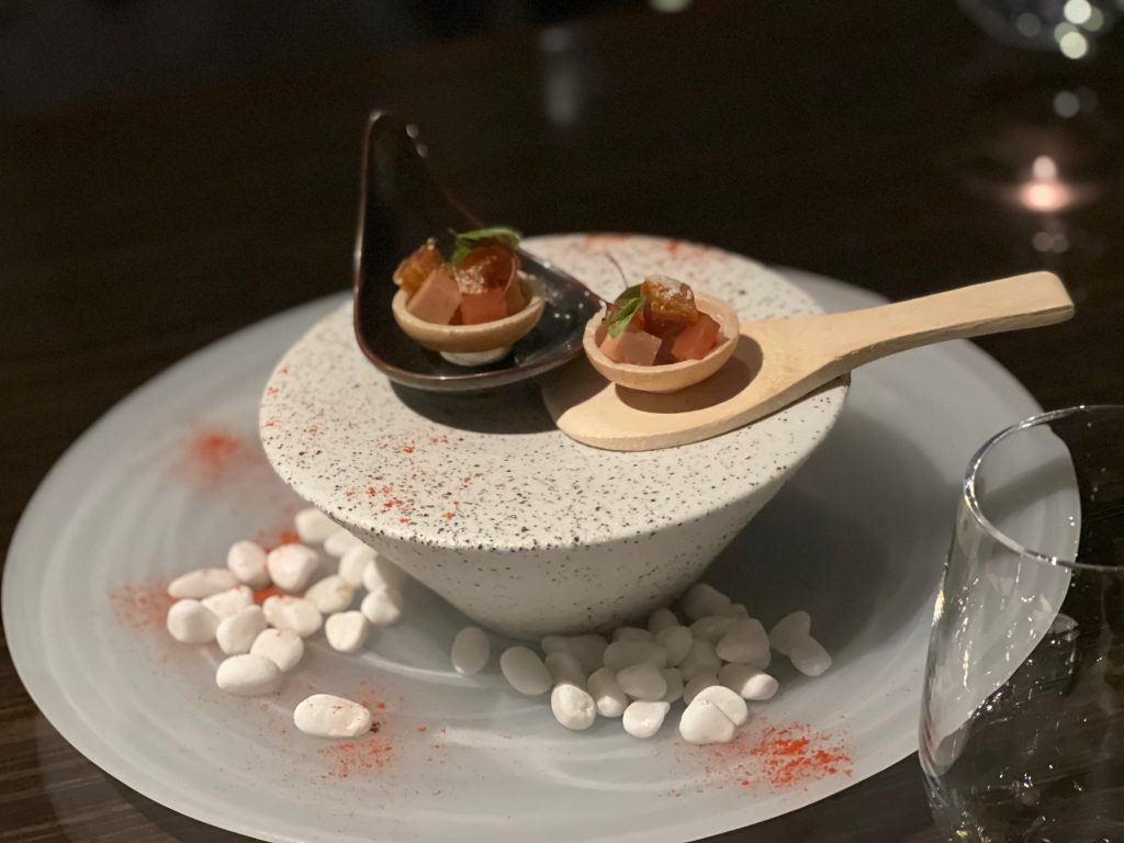 広島の「祇園坊柿」を使用。肉厚でぎっしりとした詰まった実が特長です。宮城産のデリシャストマトのジュレでほのかな酸味を加えました。宮島を代表する名産品・しゃもじに見立てた盛り付けも素敵です。