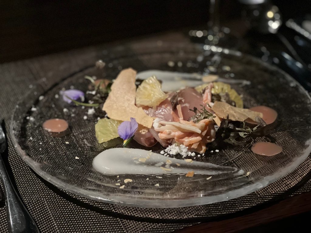 ハマチのレモンと塩竃市産藻塩のマリネ 根セロリとタスマニアマスタードのレムラード 八朔のサラダ 聖護院かぶのソース