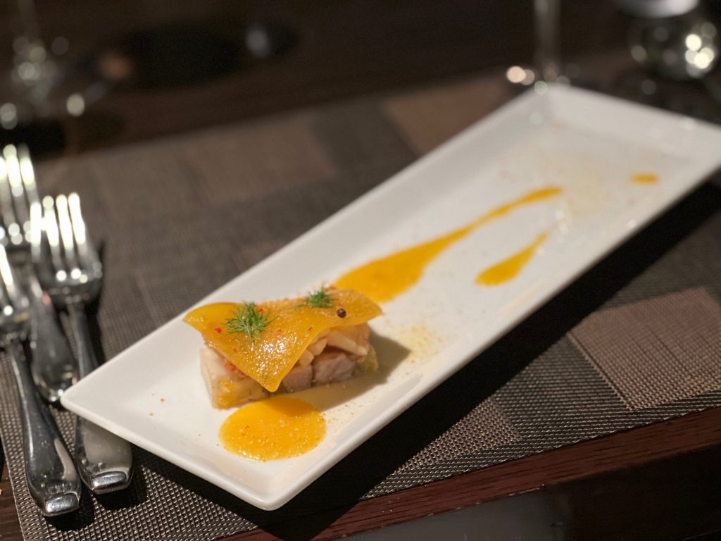 シャンパン香るオマール海老のポッシェ 宮城県産アンコウ 広島みかんのショーフロア仕立て