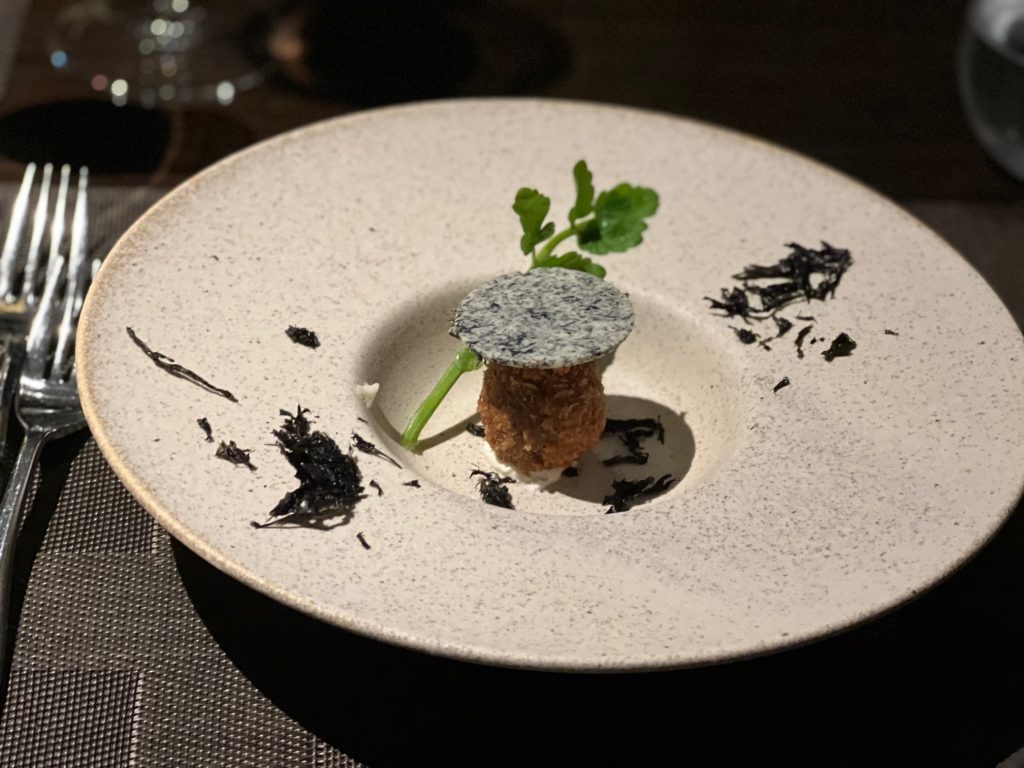 穴子と牛ホホ肉のクロケット 東松島市産金のばら干し海苔 スパイス香る鹿肉のコンソメスープとともに