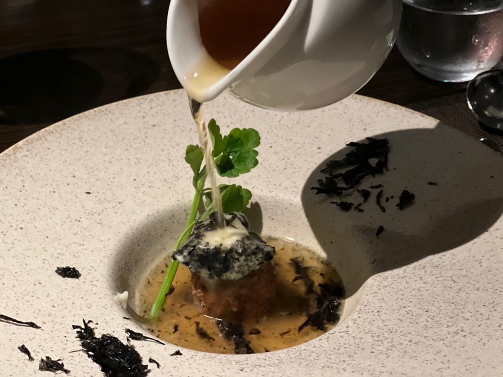 広島血統和牛「元就(もとなり)」のグリル 仙台小ねぎ香る白合根餅を添えて 竹鶴ウイスキー香るトリュフソース