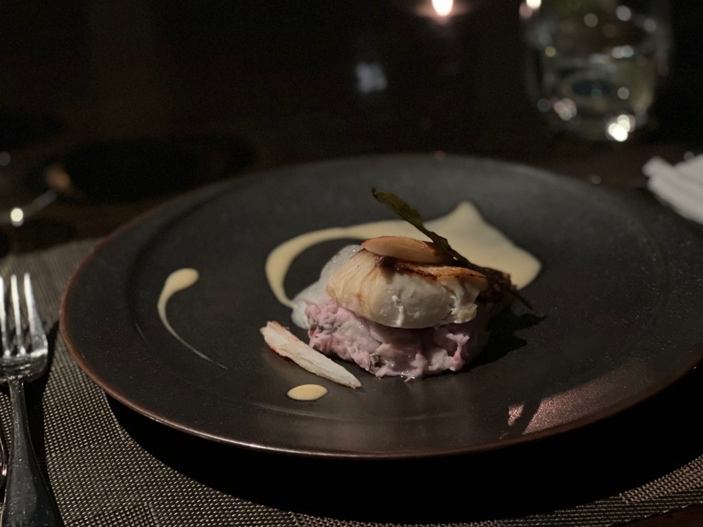 広島が日本一の生産量を誇るハマチを使った冷前菜。ハマチの下には濃厚なホタテのムースが隠れています。カリカリとしたホタテのチップが食感のアクセントとなり、白トリュフソースの上品な香りが高級感を演出するひと皿です。