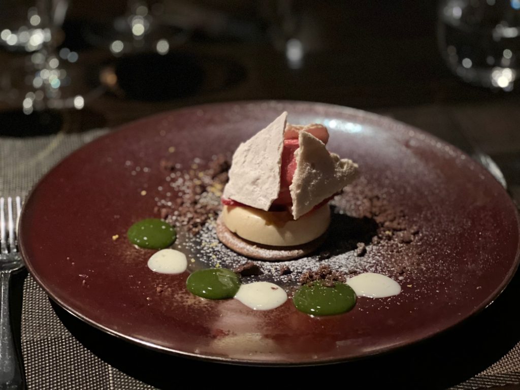 下からヘーゼツナッツ生地、レモンムース、瀬戸内レモンのコンフィチュール、にこにこベリーのアイス、メレンゲと、緻密な層が美しいデザート。抹茶とレモンのソースも相性抜群です。