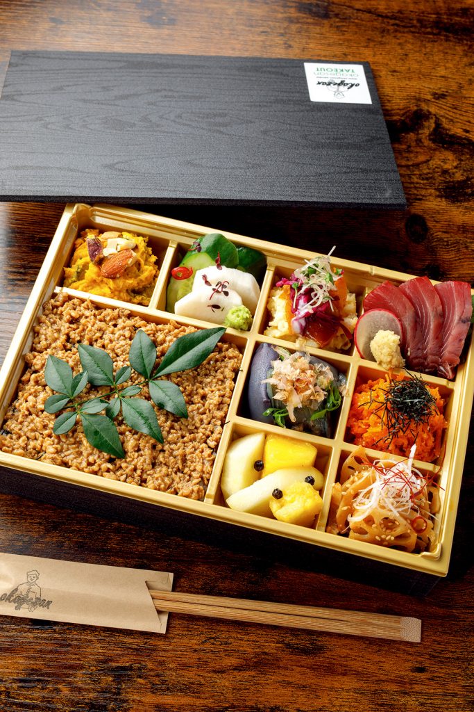カジュアルかつ上品な雰囲気のネオ酒場『おかげさん』。『東北大学病院』からほど近い木町に店を構えています。地鶏や赤鶏を使った焼鳥と旬魚の刺身、多彩な惣菜が店の自慢です。彩り豊かな惣菜を自宅でも楽しめるのが、その名も「SOUZAI8」。メインは鶏そぼろ飯。仙台雪菜、レンコンなどの季節の食材を用いた惣菜7種、朝に仕入れる刺身が脇を固めます。
