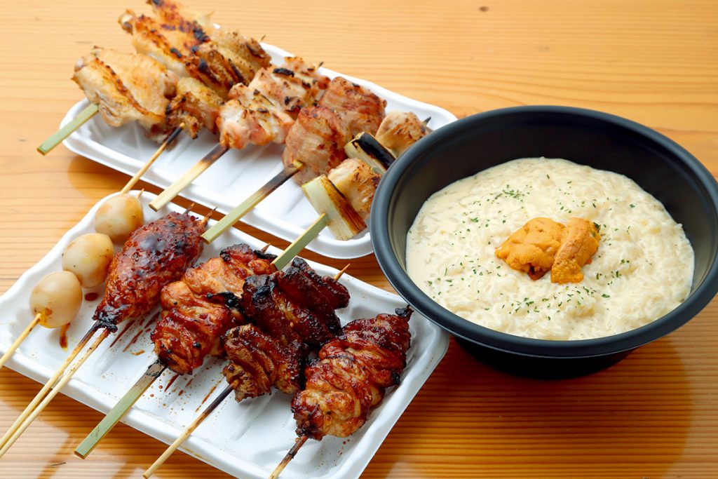 「炭火やきとり(5本)」(1皿950円)、「ウニクリームリゾットキット」(900円)