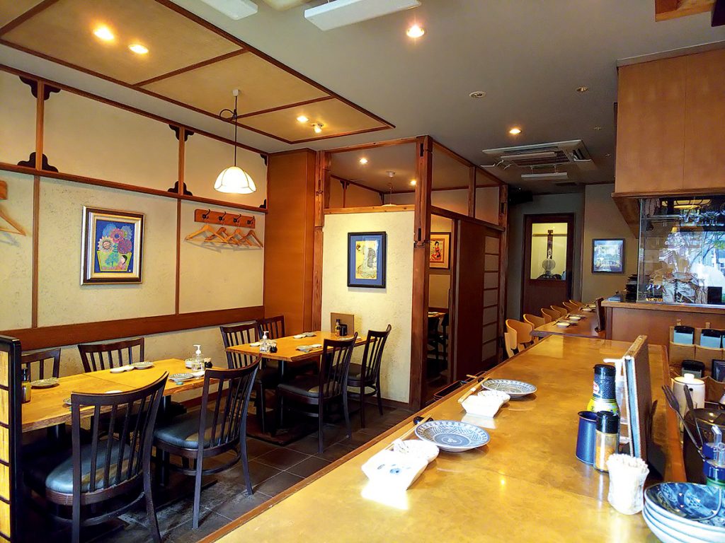 女将さんが立つ厨房をぐるっと囲むカウンターのほか、座敷席とテーブル席もあります