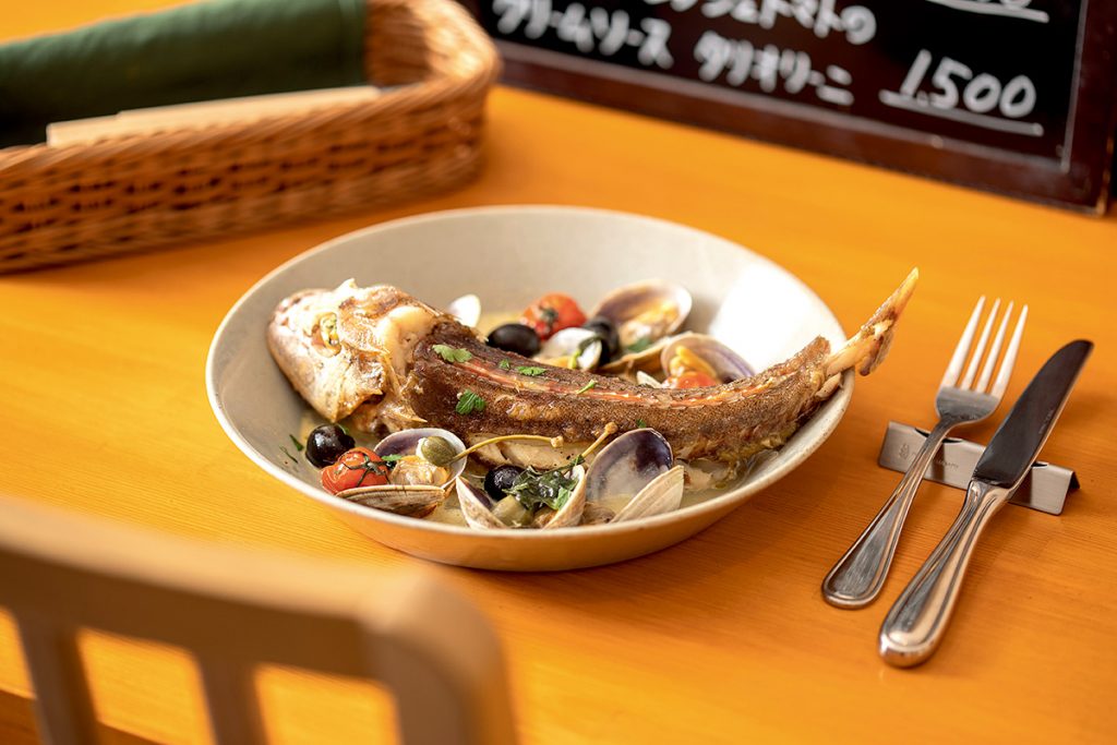 イートインメニューの「ホウボウのアクアパッツァ」(1,850円)。使う魚は季節によって変わります