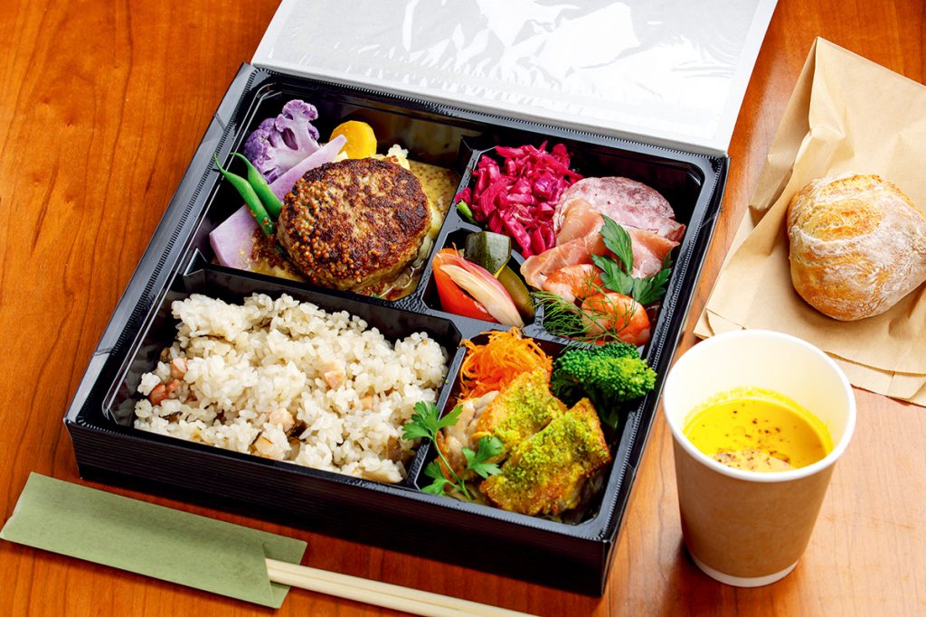 オーナーの目利きで仕入れた新鮮素材を、季節感たっぷりに仕立てる料理が魅力です。テイクアウトにも力を入れていますよ。おすすめは、人気のランチメニューを詰めた「特製ハンバーグ弁当」(1,944円)。マスタードソースをまとったハンバーグと彩り豊かな日替りおかずが詰められています。原木マイタケのピラフなど、シェフの技が随所にキラリ。『BISTRO ENCORE』には欠かせない、自家製パンとスープも付いています。