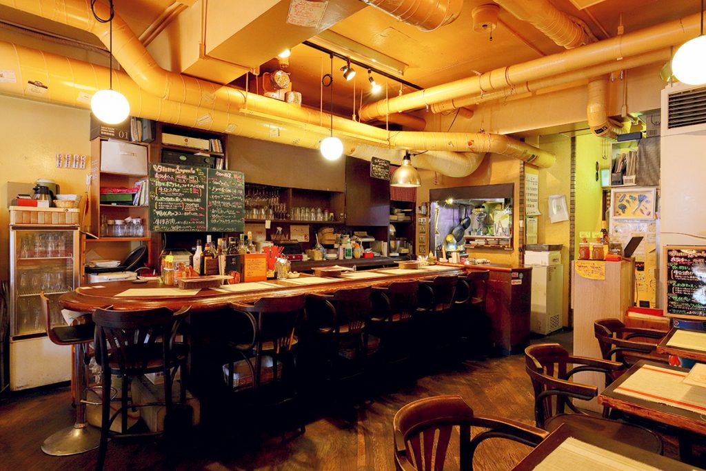 温かみがあるオレンジ色のライトが灯る店内。カウンター席とテーブル席があります