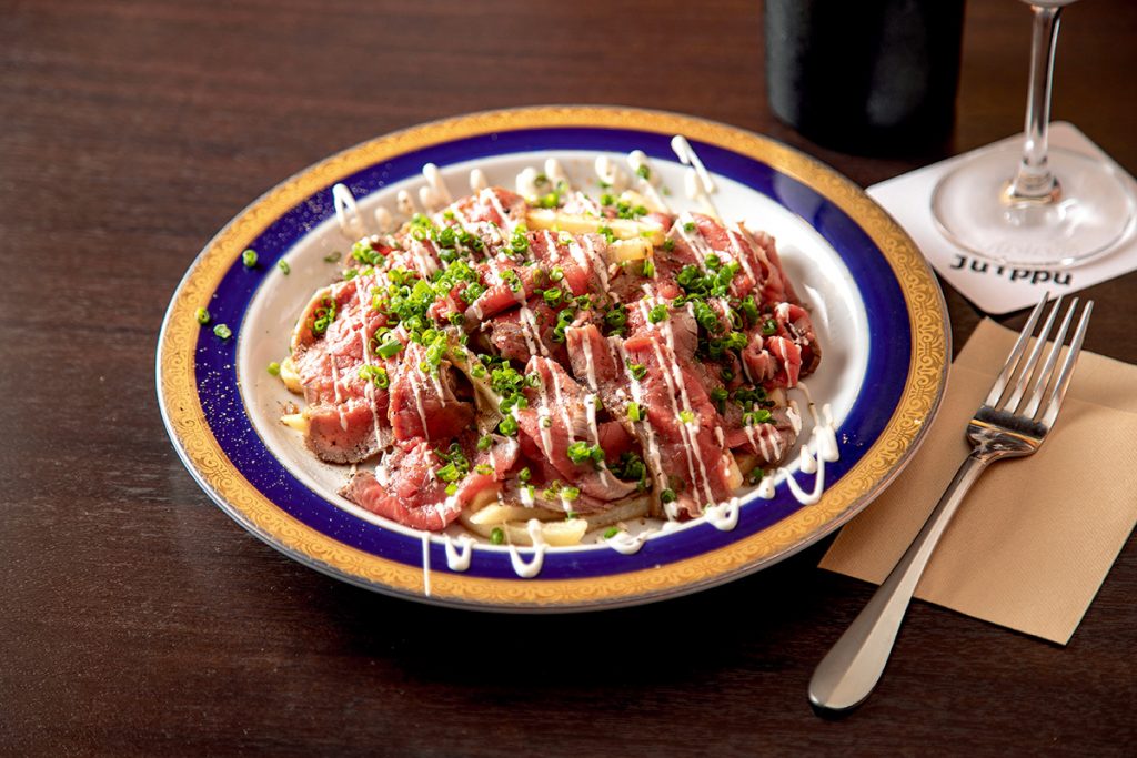 酸味の効いたヨーグルトソースと濃厚ソースで味わう「特製ローストビーフ フライドポテト添え」(1,100円)