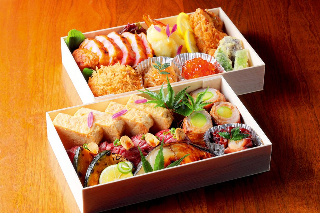 仙台牛炙りすし、銀たら西京焼き、厚焼き玉子、アスパラ肉巻き、焼き野菜、たこの柔らか煮、鶏の唐揚げ、カニクリームコロッケ、えびのオレンジマヨネーズソース、自家製さつま揚げ、いくらおろし、レンコンきんぴら、野菜天ぷら