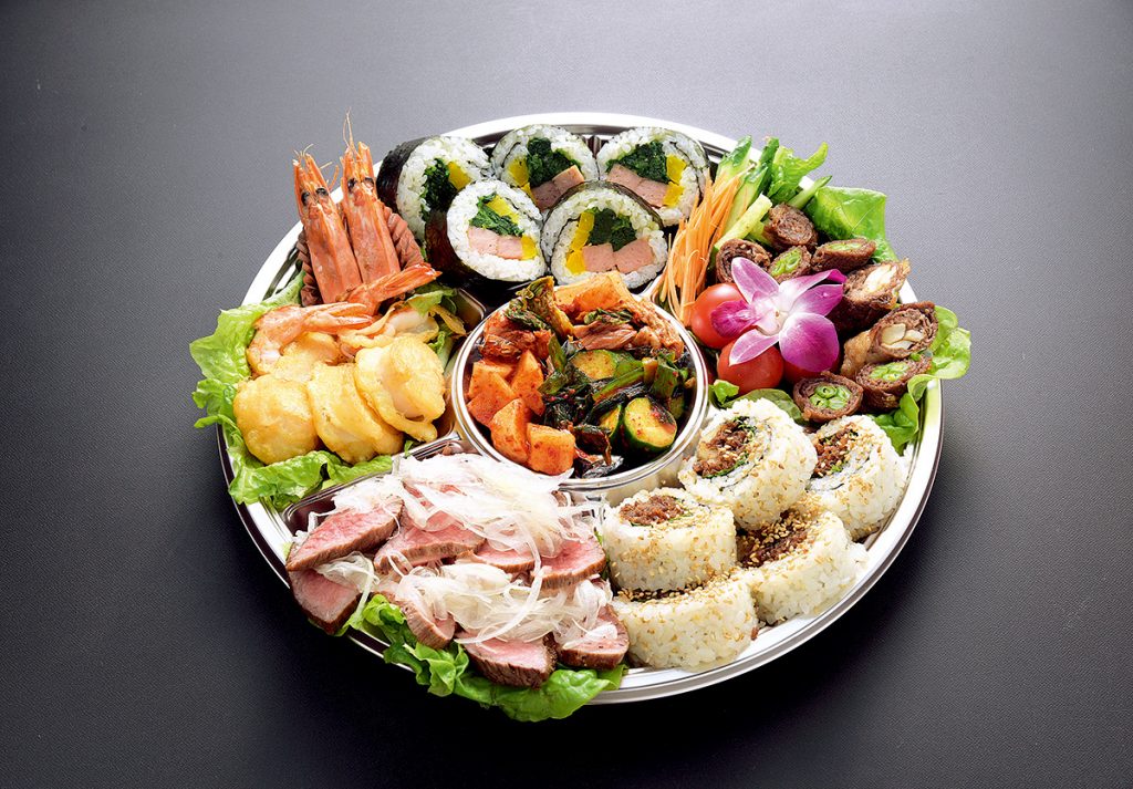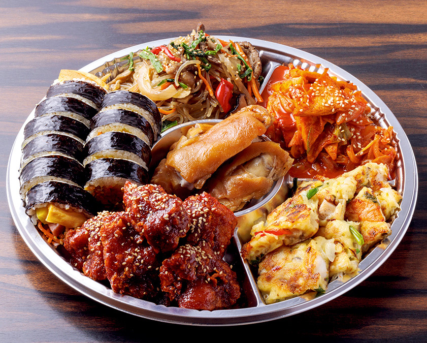 ヤンニョムチキン、海鮮チヂミ、トッポギ、豚足、チャプチェ、七種の具材海苔巻き(キンパ)