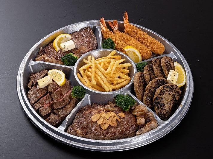 サーロインステーキ250g×2、贅ステーキ450ℊ、ハンバーグ、エビフライ、フライドポテト
