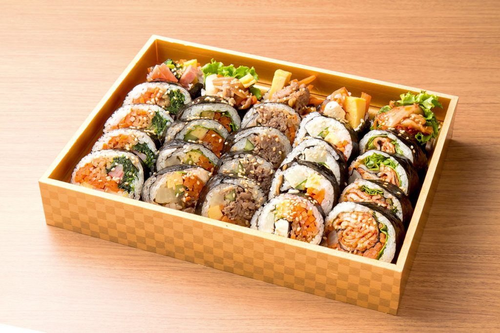 韓国の海苔巻き「キンパ」のテイクアウト専門店です。こちらのキンパは「ご飯少なめ・具材たっぷり」。米は、冷めてもおいしい「つや姫」、海苔は、パリッと厚みのある有明海産「風雅の海苔」を使用しています。「キンパオードブルハーフ」は、店の定番キンパ5種類が5切れずつ入っています。ヤンニョムチキンやチヂミなどを添えれば、韓流パーティメニューが完成!5~10人用の「キンパオードブルレギュラー」(3,996円)の用意もあります。