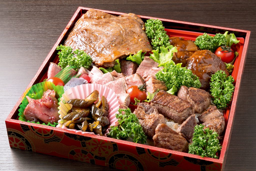 贅沢なステーキを手ごろな価格で楽しめるとあって、家族連れにも人気の店です。店内メニューに負けず劣らず、テイクアウトメニューも充実していますよ。「贅沢オードブル」は、総重量1.6kg超のド迫力!脂を湛えたサーロインに、程よい噛み応えのカイノミがドーンと乗ったボリューム満点のプレートです。合い挽き肉でふわふわに仕立てたハンバーグも入っていますよ。主役級のメニューが並んだ様子は圧巻です。