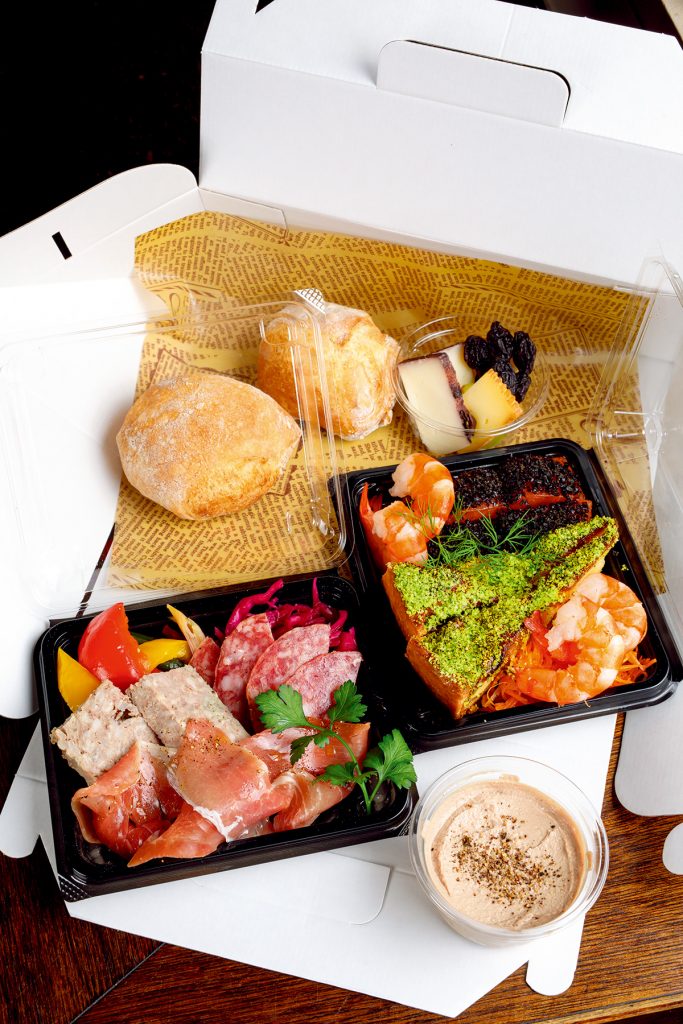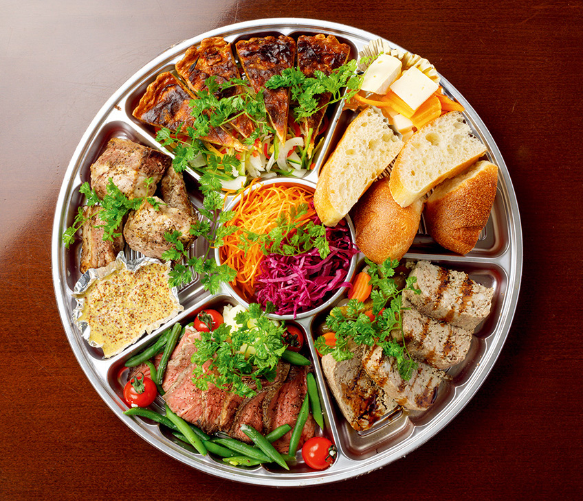 キッシュ、サーモンの低温コンフィ、エビのマリネ、キャロットラぺ、パテ・ド・カンパーニュ、生ハム、イベリコ豚のサラミ、紫キャベツのマリネ、自家製ピクルス、鶏白レバーのペースト、チーズ各種、自家製パン※仕入れ状況によって内容変更あり