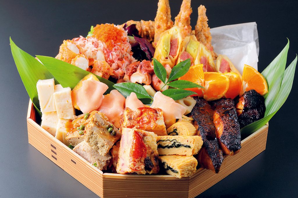 子持ちシシャモの天ぷら、ハムとサツマイモの春巻き、みかん、銀たらの照り焼き、玉子焼き、イチジク生ハム、牛肉のパテ、自家製かまぼこ、カニのサラダ、旬の十種炊き合わせ