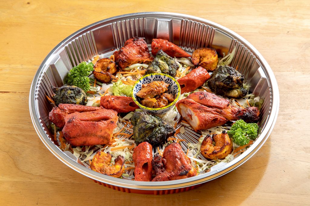 エビのグリル、マライティッカ、シーカバブ、タンドリーチキン、サモサ、チーズオムレツ