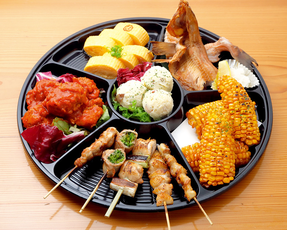 出汁巻きたまご、バッファローチキン、串盛り合わせ、揚げとうもろこし、焼き魚~縞ホッケ焼き~、いぶりがっこ入り自家製ポテトサラダ※季節によって内容変更あり