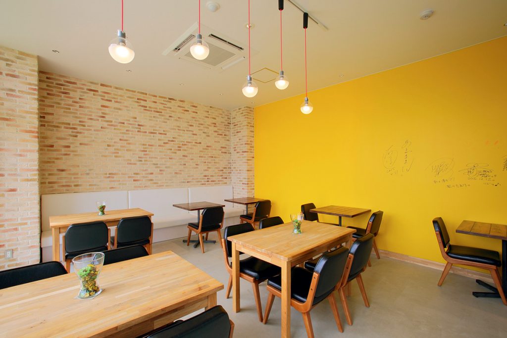 映画の中で、主人公たちが塗り上げた黄色い壁が印象的。店内には映画撮影時に使用した小道具や出演者たちのサインも!