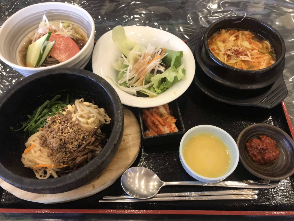 「汗蒸幕セット」(1,300円)。石焼ビビンバ、韓国冷麺、おまかせチゲがすべて楽しめる贅沢なセット。すべてハーフサイズなので女性でもペロッと完食できちゃいます。サラダやデザートまで付いてくるのもうれしい。
