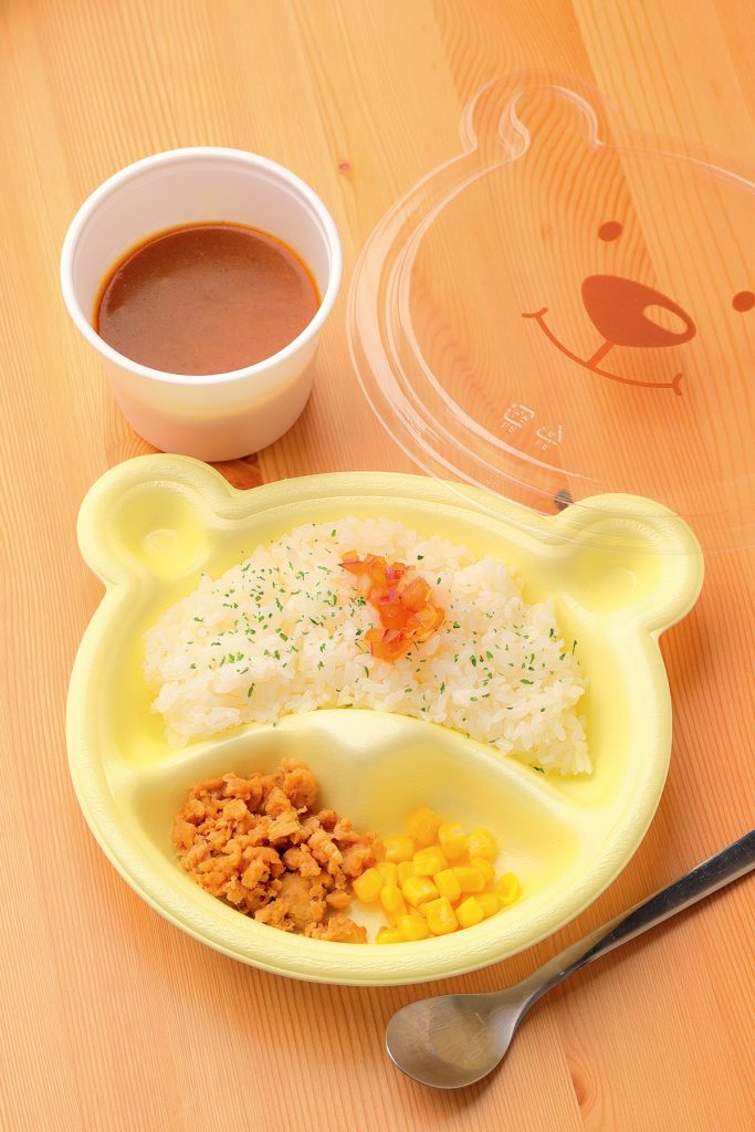 テイクアウト用の「お子様カレーセット」(450円)はくまちゃんパック入り。イートインの場合はお皿で提供(タマゴ付500円)
