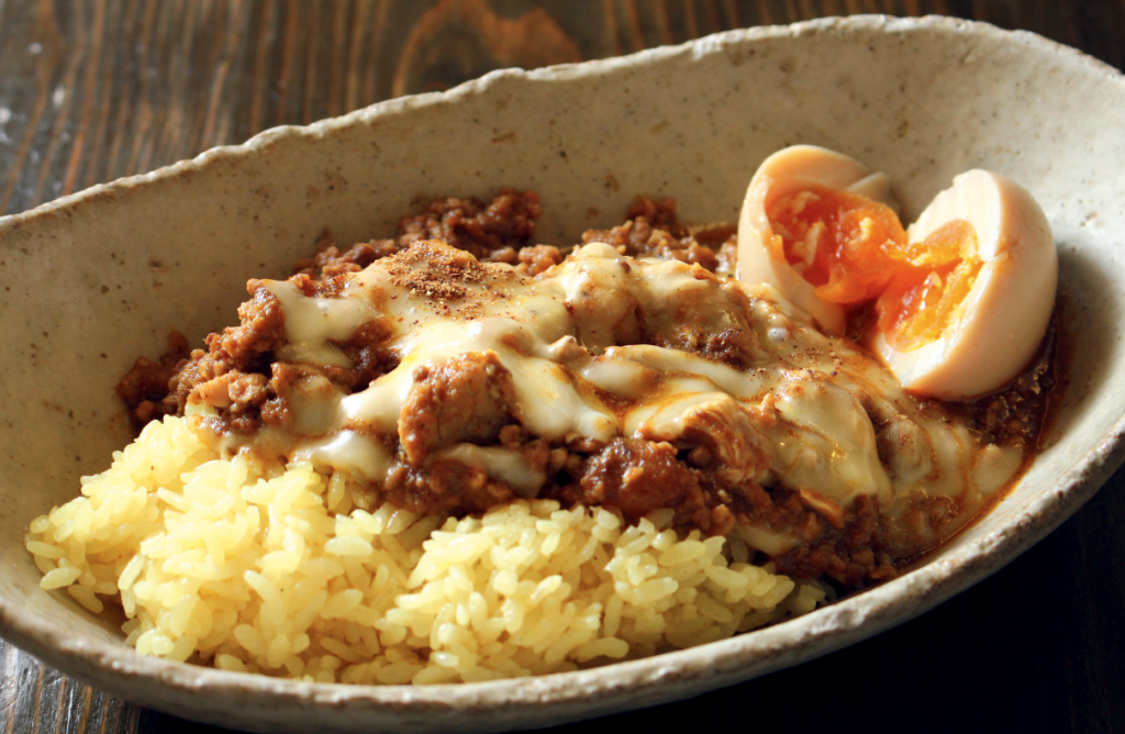 「やまんカレー」(1,000円)。マイルドなチキンカレーと刺激的な黒キーマを合わせたルウに、たっぷりチーズと味玉が好相性