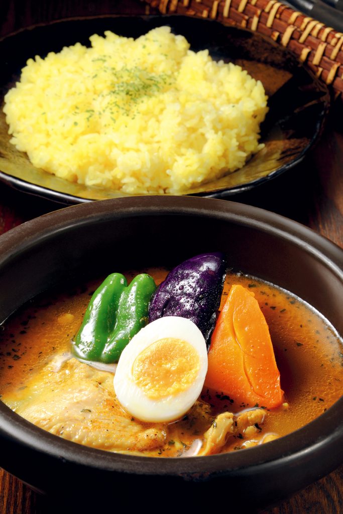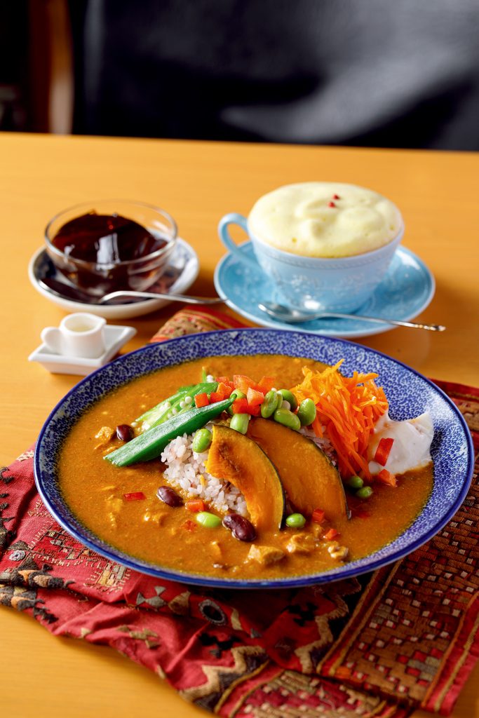 店で調合するオーガニックスパイスを用いたスープカレーの専門店。中でも人気の「おもいっきり野菜」は、北海道産のマイタケやジャガイモをはじめ10種類以上の野菜がゴロゴロと入ったひと品です。素材に合わせて素揚げorボイルした野菜の甘みがスープに溶け出し、ひと口食べれば具材とスープの旨みがじわりと広がりますよ。