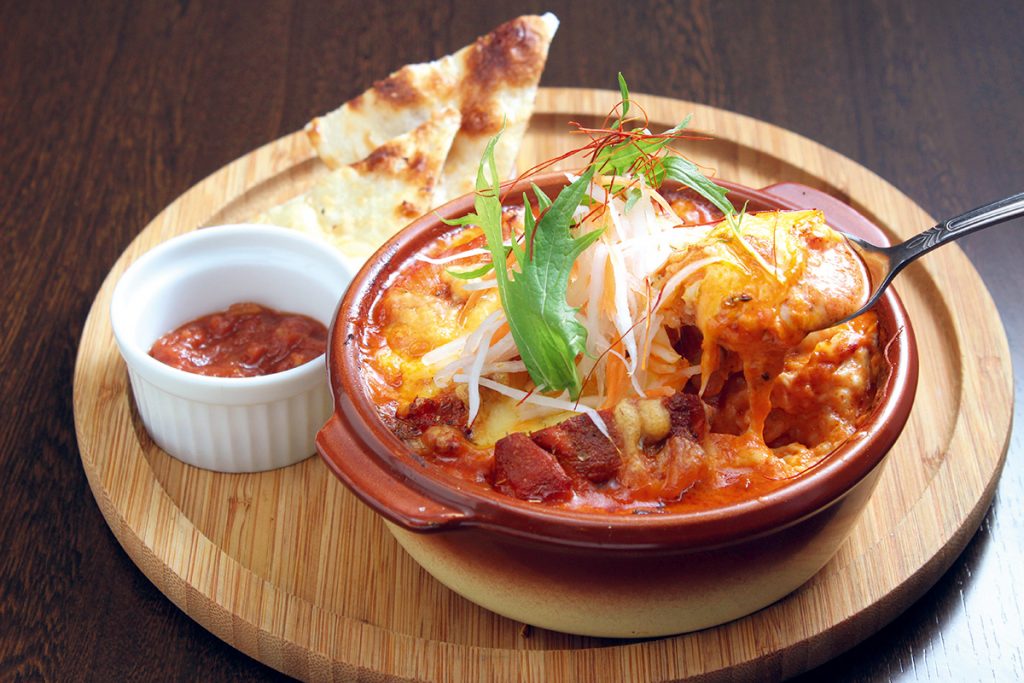 40種類以上のスパイスを使った「バターチキンカレー」。フルーティなトマトと生クリームのコクが活きた店の人気No.1メニューです。そのままでもおいしいカレーをご飯の上にたっぷりとのせ、チーズとともに焼き上げた「バターチキンドリア」は、ボリューム満点のひと品。香ばしいガーリックナンも付いて大満足間違いなしです!