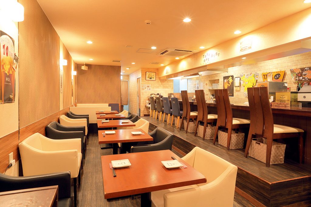 テーブル席とカウンターのある落ち着いた雰囲気の店内